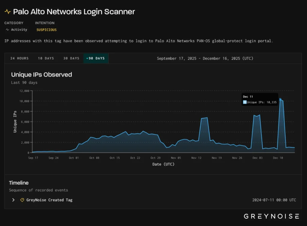 Le 11 décembre, la plateforme de surveillance des menaces GreyNoise a observé que le nombre de tentatives de connexion visant les portails GlobalProtect avait culminé à 1,7 million sur une période de 16 heures.