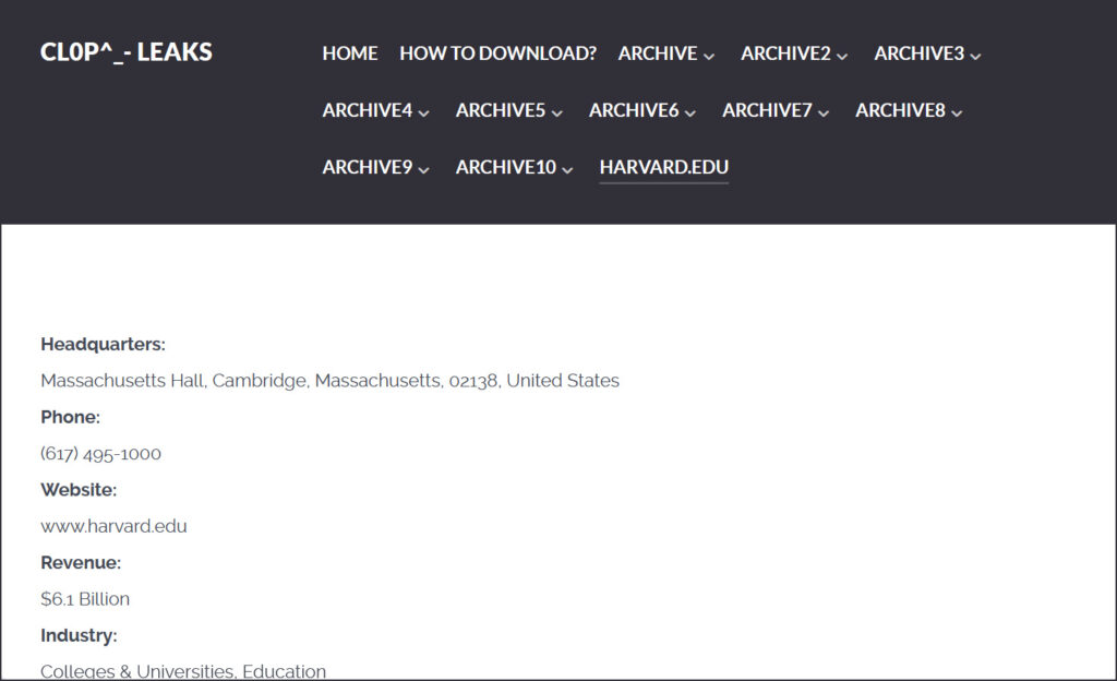 Harvard sur le site de fuite de données de Clop: