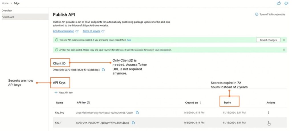 Les développeurs Edge peuvent essayer la nouvelle expérience de gestion des clés API dans leur tableau de bord Partner Center.