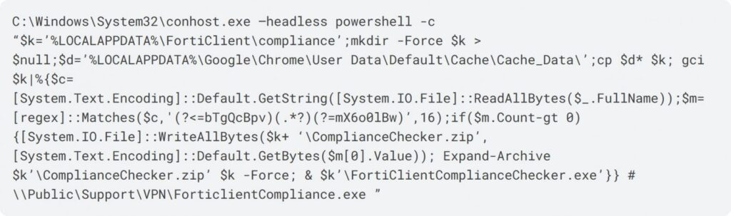 La commande PowerShell crée d’abord le dossier %LOCALAPPDATA%\FortiClient\compliance, puis copie les fichiers de cache de Chrome à partir de %LOCALAPPDATA%\Google\Chrome\User Data\Default\Cache\Cache_Data\ dans ce dossier.